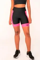 Bermuda fitness preta com recortes laterais em pink e cós alto que garante firmeza e conforto. Ideal para treinos com estilo e liberdade de movimento.