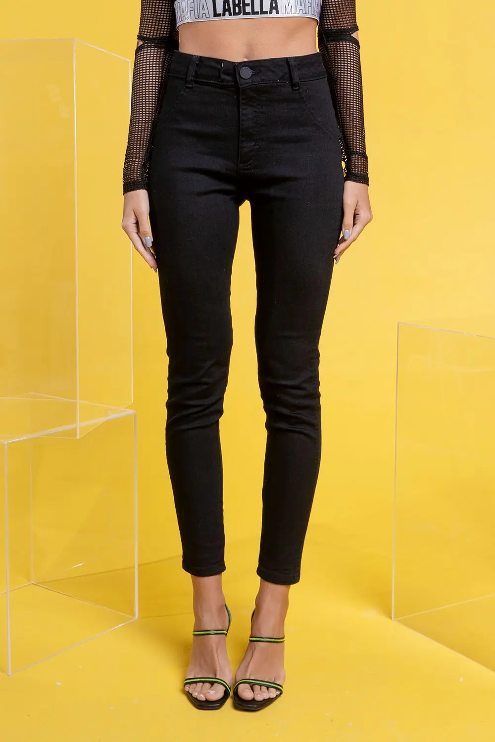 Características: Calça confeccionada em jeans preto, com recorte atrás que valoriza o bumbum. Possui bolsos frontais falsos e bolsos traseiros. Com fechamento em botão e zíper na frente. Possui plaquinha emborrachada amarela atrás.