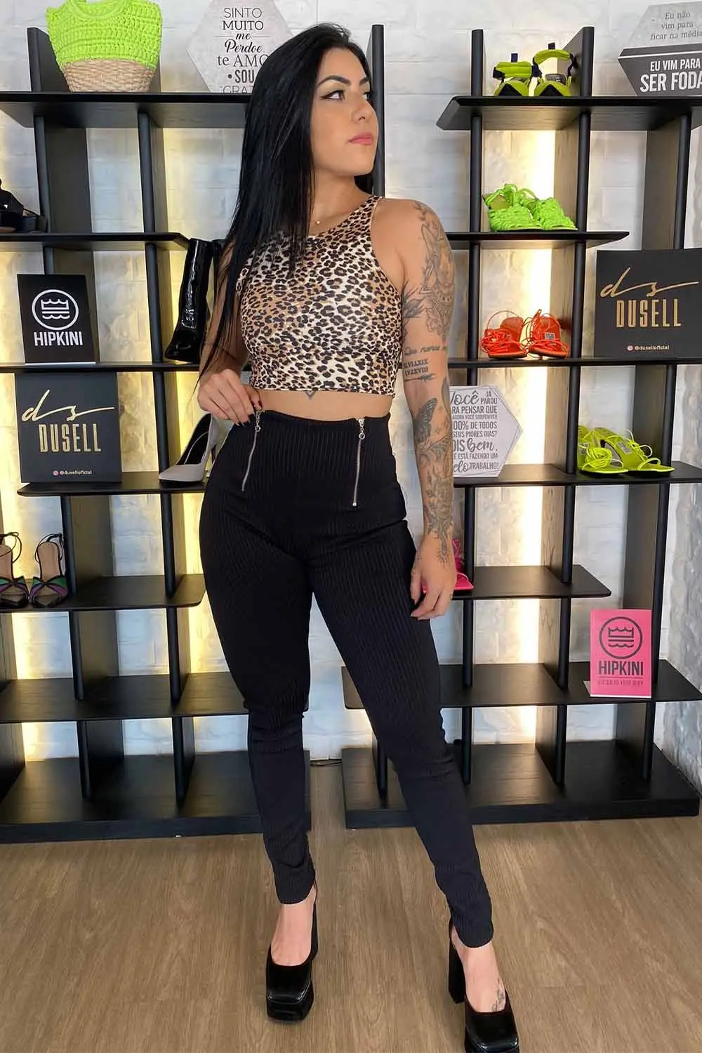 Características: Calça com alto poder de compressão, tecido texturizado canelado e zipers frontais dourados, que dão toda a elegância ao look.