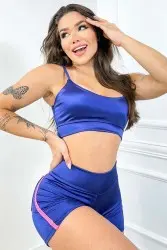 Características: Conjunto azul cropped e shorts com detalhe sutil em rosa nas laterais das coxas.