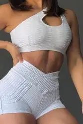 Características: Um conjunto de short e top em tecido brocado com detalhes, ambos em branco. Possui empina bumbum.