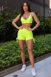 Características: Conjunto fitness texturizado verde neon, composto por um top com decote largo em V e alças grossas, além de um short com alças decorativas penduradas nas laterais da peça.