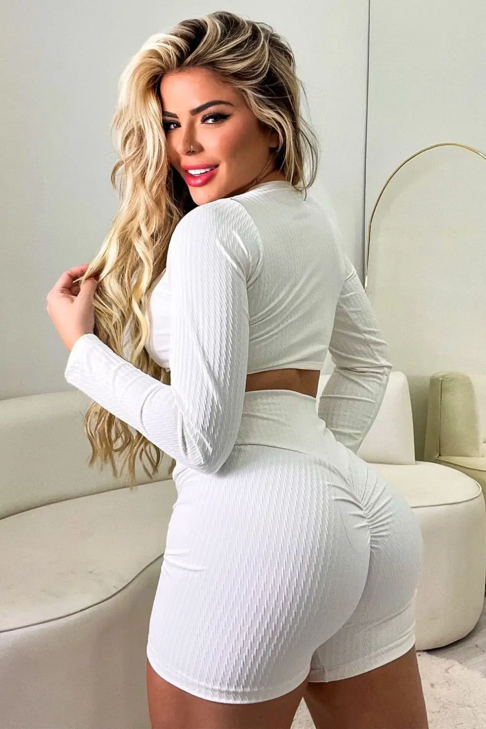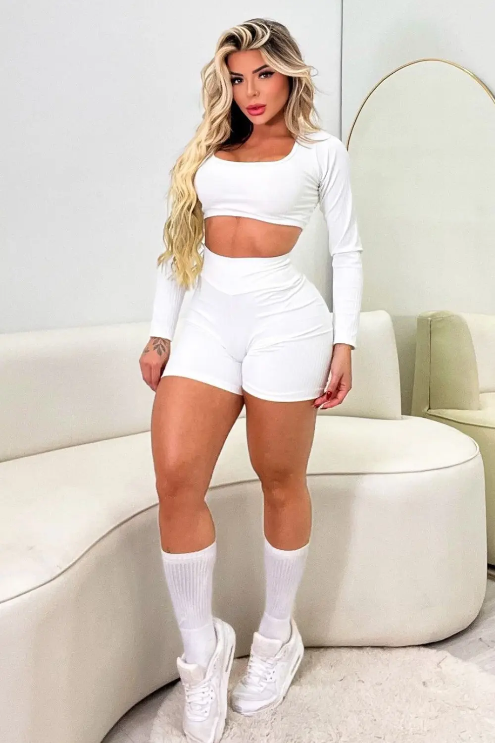 Cropped de manga longa em tecido canelado branco com textura leve. Possui decote quadrado que valoriza o colo e modelagem ajustada ao corpo. Confortável e estiloso, é ideal para quem busca um visual clean, elegante e versátil, tanto para o treino quanto para o lifestyle. Shorts canelado branco de cintura alta, com recorte anatômico e detalhe de franzido no bumbum que realça a silhueta. O comprimento curto proporciona liberdade de movimento e o tecido com leve compressão garante segurança e conforto.