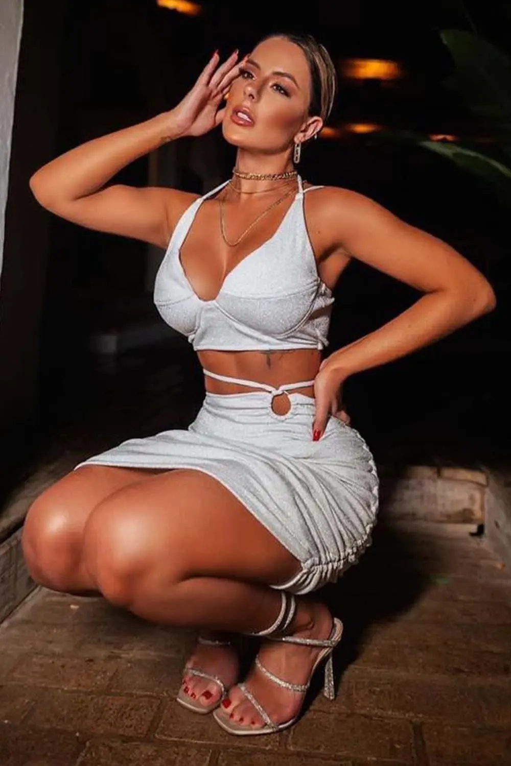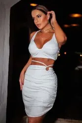 Características: Conjunto em lurex composto por top alças finas com bojo e aro, saia mid colada com detalhe franzido e amarração.