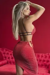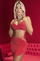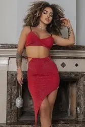 Características: Conjunto confeccionado em tecido vermelho com detalhes adicionais de brilho, o conjunto é composto por top somente frontal e saia com aberturas decorativas nas laterais da cintura.