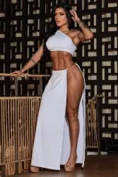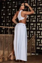 Características: Conjunto branco, composto por um top com alça única grossa e uma saia longa com ampla abertura decorativa que deixa à mostra a perna direita.
