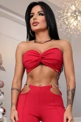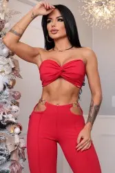 Características: Um elegante conjunto vermelho, composto por um top cropped confeccionado com tecido franzido na frente do busto e sem alças, e uma calça com aberturas decorativas nas laterais da cintura, que são sobrepostas por fivelas douradas que amarre o tecido.