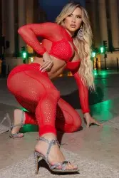 Conjunto Red Glam com top e calça em tule com bojos, adornado com detalhes em hot fix para um brilho sofisticado. Perfeito para quem busca elegância e um toque de glamour no visual.