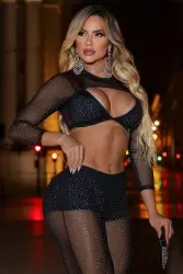 Conjunto Black Glam com top e calça em tule com bojos, adornado com detalhes em hot fix para um brilho sofisticado. Perfeito para quem busca elegância e um toque de glamour no visual.