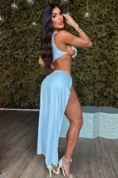 Características: Conjunto branco, composto por um top com alça única grossa e uma saia longa com ampla abertura decorativa que deixa à mostra a perna direita.