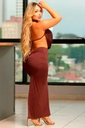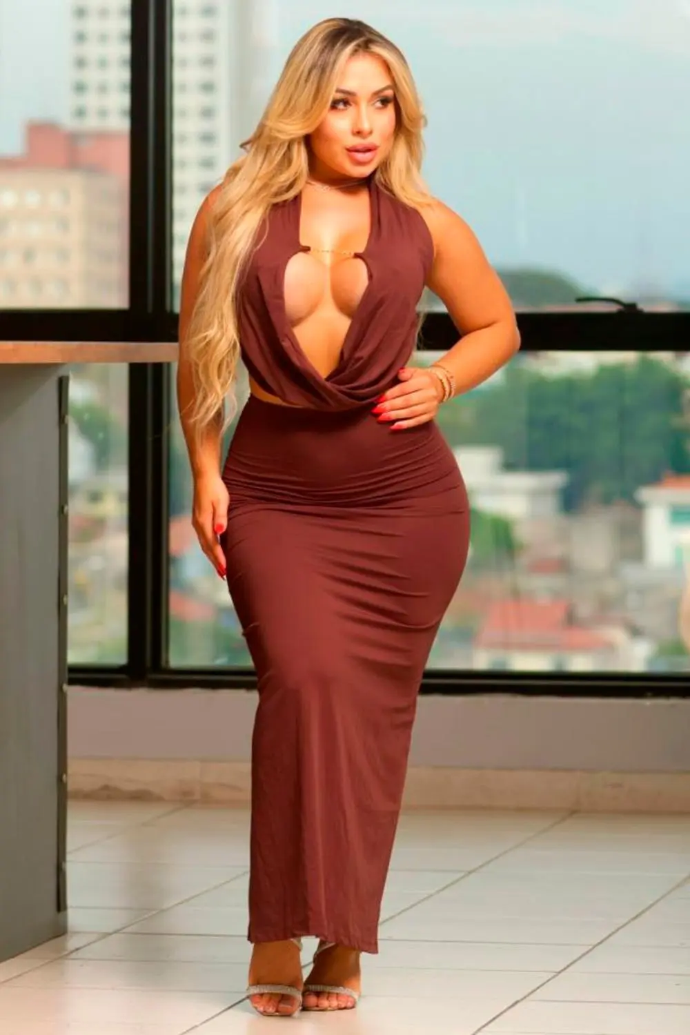 Esse combina sensualidade e sofisticação em um look único. O top com decote drapeado e detalhe dourado realça o colo, enquanto a saia longa com recorte traseiro e franzido valoriza as curvas e alonga a silhueta. Perfeito para eventos e ocasiões especiais, entrega caimento impecável e presença marcante.