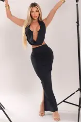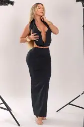 Esse combina sensualidade e sofisticação em um look único. O top com decote drapeado e detalhe dourado realça o colo, enquanto a saia longa com recorte traseiro e franzido valoriza as curvas e alonga a silhueta. Perfeito para eventos e ocasiões especiais, entrega caimento impecável e presença marcante.
