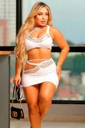 Conjunto branco justo com aplicações de pedrinhas, composto por top com recorte moderno e saia curta com amarração lateral. Modelo que valoriza as curvas com toque sofisticado e sensual.