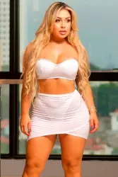 Conjunto feminino branco composto por top tomara que caia estruturado e saia curta. Modelagem justa que realça a silhueta com toque sofisticado e sensual.