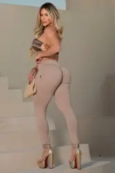 Conjunto moderno e sofisticado, composto por top estruturado em tons terrosos com recorte central, combinando com calça nude de cintura alta que valoriza as curvas e oferece perfeito caimento.