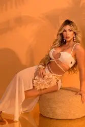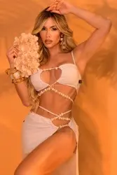 Conjunto elegante em tom branco, composto por top com design ousado, recortes estratégicos e amarrações que valorizam a cintura. A saia longa com transparência suave e fenda marcada adiciona leveza e movimento. Um look sofisticado, ideal para eventos de verão e produções que pedem presença e estilo.
