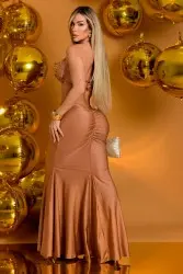 Conjunto sofisticado e ousado, composto por top estruturado com aplicações de pedrinhas douradas e amarração nas costas, valorizando o busto com design moderno. A saia longa preta, de caimento fluido e recorte sereia, realça a silhueta com elegância. Ideal para eventos noturnos e produções de impacto.