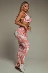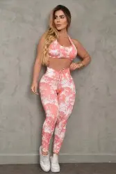 Conjunto fitness com estampa abstrata em tom de salmão. Top com costas nadador e amarração, confere sustentação no busto e o caimento fica perfeito no corpo. A legging é bem justa e fica super charmosa. Look perfeito pra qualquer ocasião.