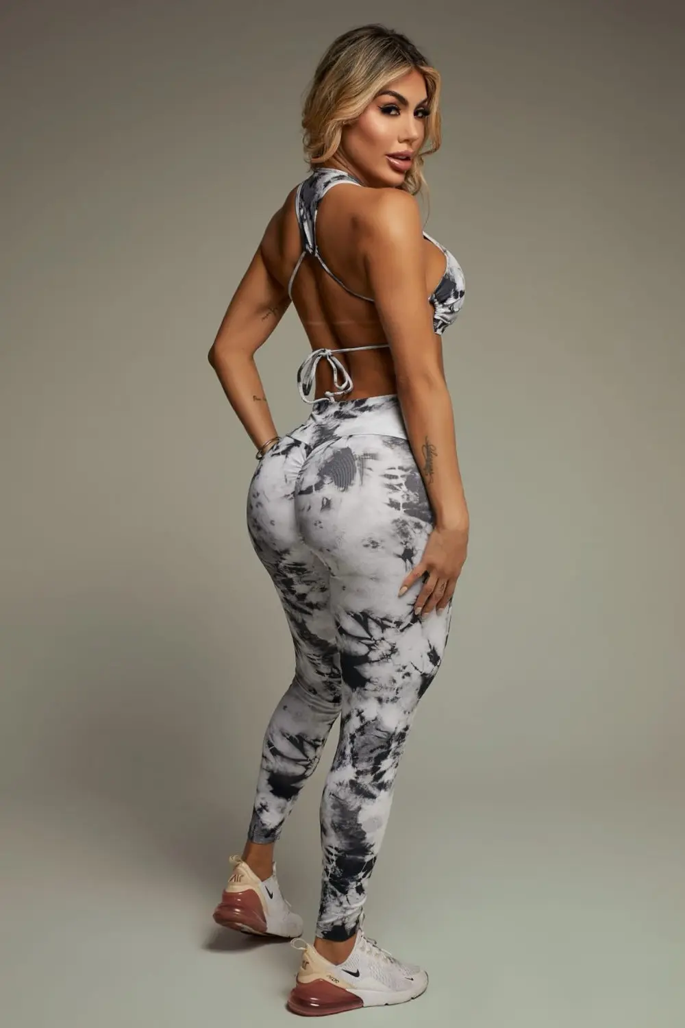 Conjuntinho longo tie dye preto e branco e tecido ajustado ao corpo. A legging tem cós alto com amarração, que dá firmeza e segurança e empina bumbum. O top tem alças médias com as costas abertas e desenhadas em forma de nadador, trazendo mais charme e delicadeza ao look.