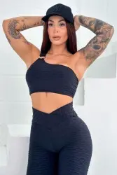 Conjunto fitness feminino em tom rosa vibrante, composto por top e legging. O top possui design de um ombro só, com alça dupla cruzada nas costas e detalhe metálico na alça frontal, oferecendo sustentação e estilo. A legging de cintura alta modela a silhueta com seu tecido texturizado e cós anatômico em V, proporcionando conforto e ajuste perfeito durante o treino. O tecido elástico realça as curvas e permite total liberdade de movimento.