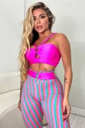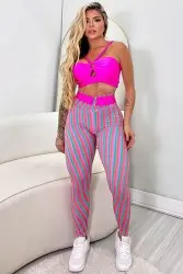 Conjunto fitness vibrante composto por top pink com detalhe em argola central e recorte frontal, valorizando o colo com um toque moderno. A calça legging apresenta listras verticais em tons de rosa, azul e verde neon, com cós alto e franzido no bumbum, realçando a silhueta e alongando a postura. Ideal para quem busca estilo marcante e conforto em peças de alta performance.