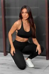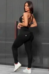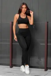 Conjunto fitness preto composto por top com alças cruzadas e recortes laterais, que valorizam as curvas com estilo e sustentação. O short modela o corpo com cintura alta e bolsos traseiros funcionais, unindo praticidade e sofisticação para seus treinos ou looks casuais. Ideal para quem busca performance com design moderno.