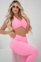 Conjunto fitness na cor rosa, composto por top e legging de cintura alta. O tecido brocado oferece textura sofisticada, alta compressão e efeito modelador, valorizando a silhueta com conforto. Ideal para treinos e looks casuais com toque de estilo.