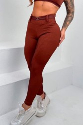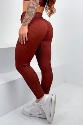 Conjunto fitness canelado marrom, composto por top estruturado e legging de cintura alta com cinto embutido. Modelagem que valoriza o corpo e une elegância e conforto para o dia a dia ou treinos.