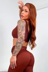 Conjunto fitness canelado marrom, composto por top estruturado e legging de cintura alta com cinto embutido. Modelagem que valoriza o corpo e une elegância e conforto para o dia a dia ou treinos.