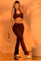 Conjunto fitness flare confeccionado em tecido de alta compressão, que valoriza as curvas e garante conforto. O top possui decote halter com franzido central e excelente sustentação, enquanto a calça flare modela o corpo e alonga a silhueta. Ideal para treinos ou composições casuais com estilo.