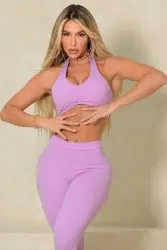 Conjunto fitness flare confeccionado em tecido de alta compressão, que valoriza as curvas e garante conforto. O top possui decote halter com franzido central e excelente sustentação, enquanto a calça flare modela o corpo e alonga a silhueta. Ideal para treinos ou composições casuais com estilo.