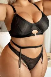 Conjunto de lingerie sensual confeccionado em tule preto com leve transparência. O sutiã possui bojo estruturado com detalhe em recorte frontal e alças ajustáveis. A calcinha fio é composta por tiras que valorizam as curvas, acompanhada de ligas com correntes douradas que trazem um toque sofisticado e ousado à peça. Ideal para momentos de pura sedução.