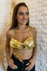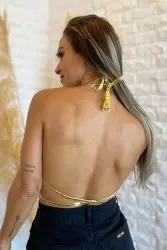 Características: Top estilo cortininha com amarração no pescoço e nas costas. Com detalhe em argola na frente.
