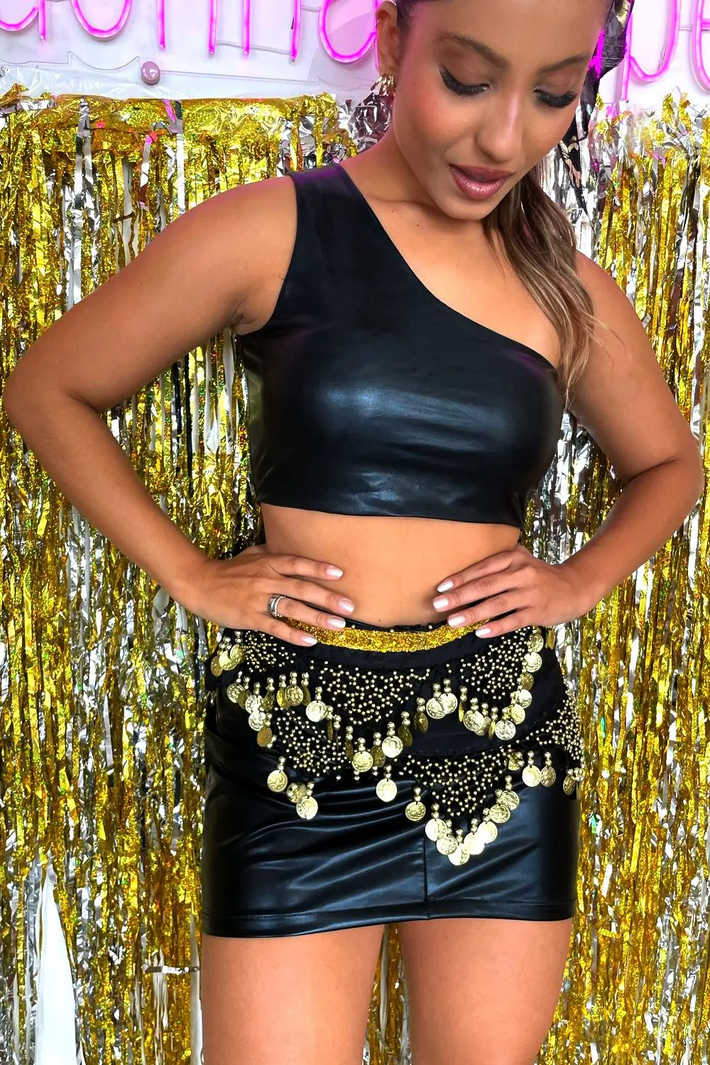Top preto fashion de courino com toque brilhante no tecido. Alça única de um ombro só, que traz elegância e estilo para o look, perfeito para ocasiões casuais ou refinadas.