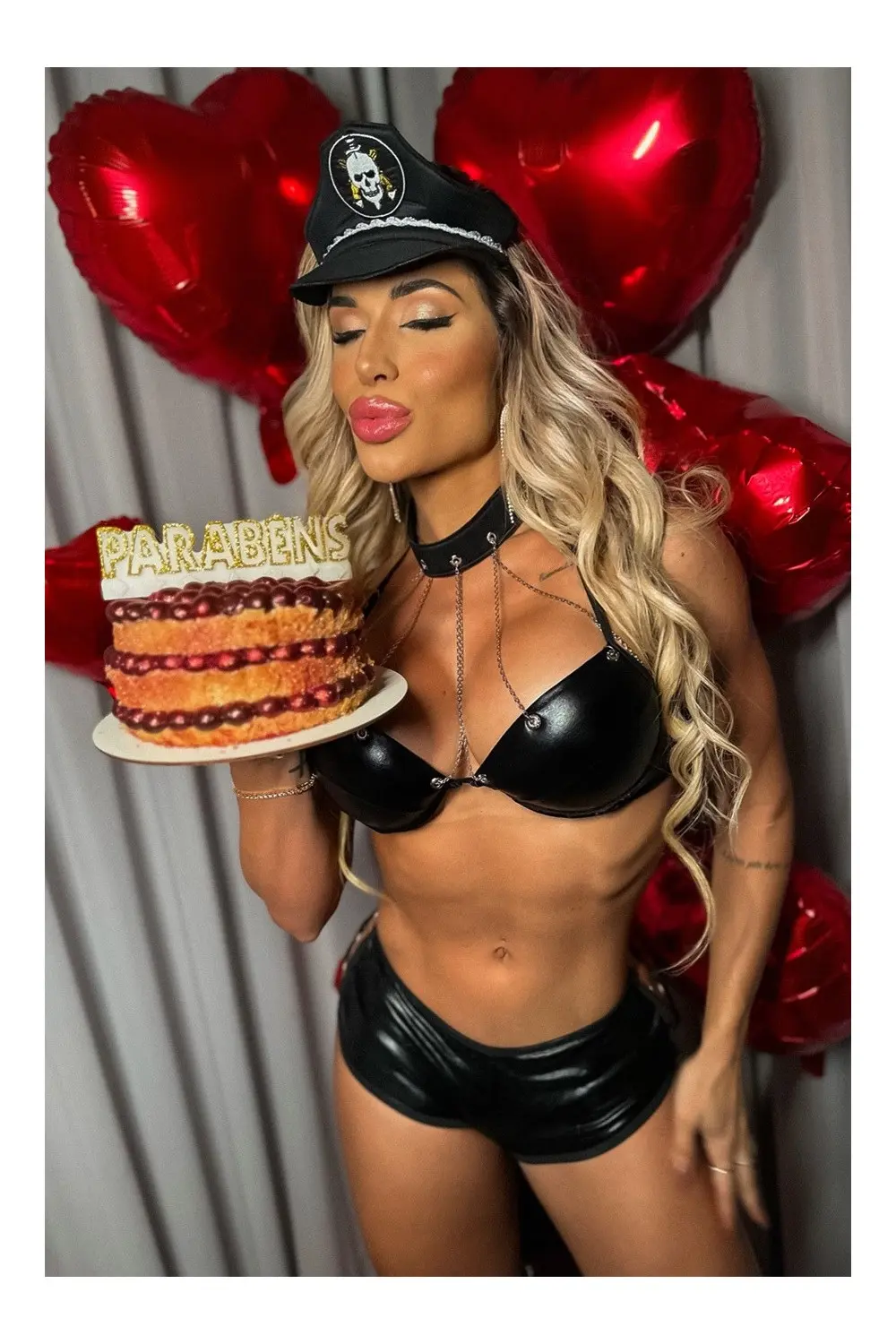 Características: Seu corte enfatiza a forma de seu corpo e o tecido garante o maximo de conforto. O short possui argolas que cativam com seu design. O sutiã com correntes, destacando a beleza do seu busto. Seu quepe em manta todo ajustável.