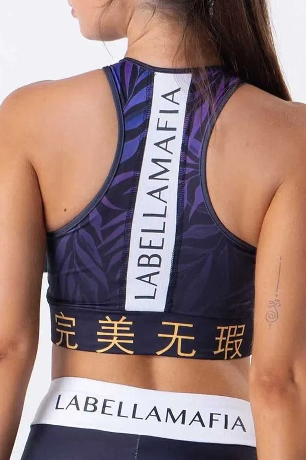 Características: Top feito em tecido estampado com design de folhas em tons de preto e roxo. Possui recorte em tecido branco nas costas com estampa LabellaMafia em Silk preto. Plaquinha emborrachada na frente. Sem bojo.