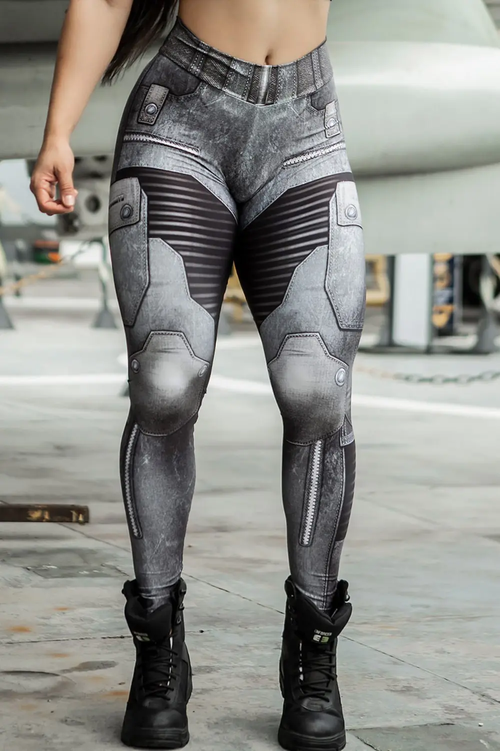 Características: Legging feita em tecido com estampa 3D com muscle shading e detalhes em metal, borracha e fake jeans. Possui elástico no cós.