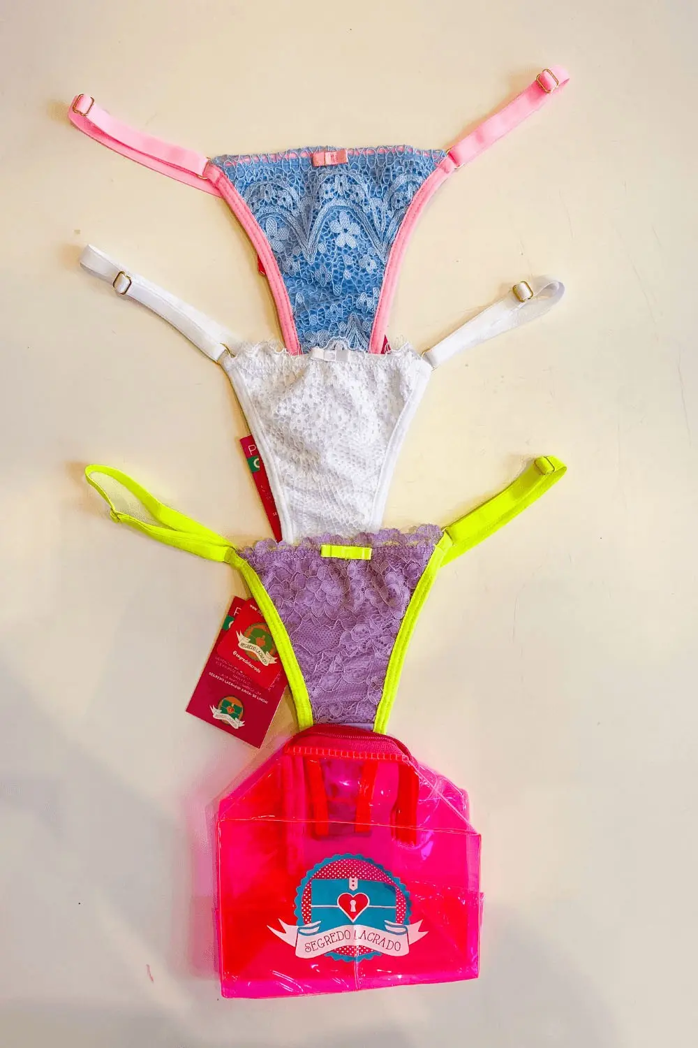 Esse kit acompanha 3 calcinhas em renda, fio duplo, com regulagem nas laterais: uma na cor roxo com detalhes em amarelo, azul com rosa e branca sendo super confortáveis e de boa qualidade.