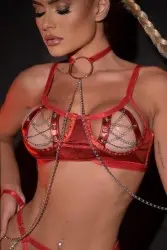 Coleira choker em cetim vermelho com argola metálica central e correntes que descem em direção ao busto, criando um visual provocante e cheio de atitude. Uma peça de impacto para quem deseja explorar o poder da sensualidade com ousadia e sofisticação.