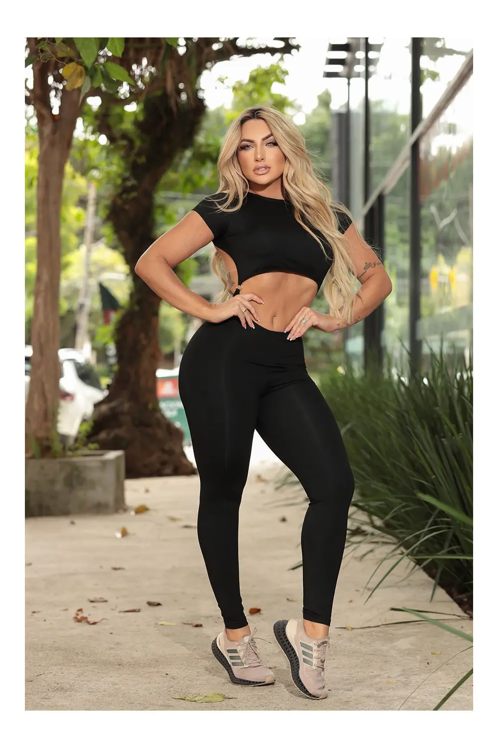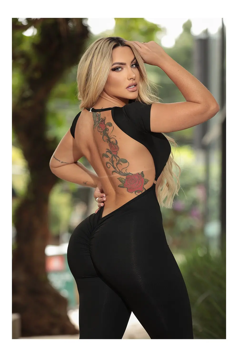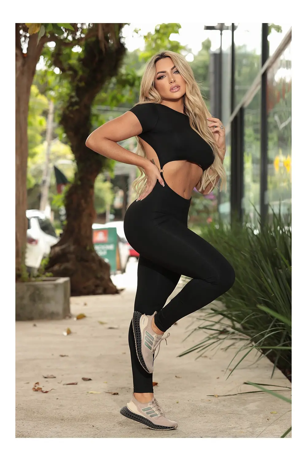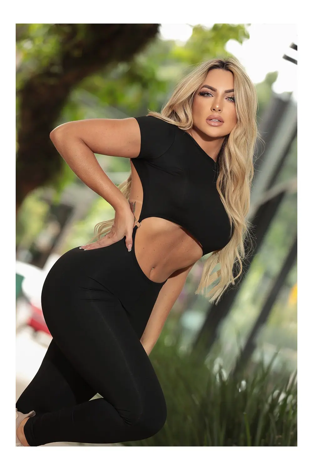 Renove o seu estilo com o nosso elegante macacão preto de manga curta – uma mistura dinâmica de conforto e elegância! Este macacão apresenta divertidas aberturas decorativas no abdômen e nas costas, adicionando um toque de charme ao seu visual.