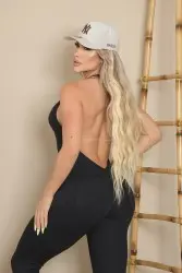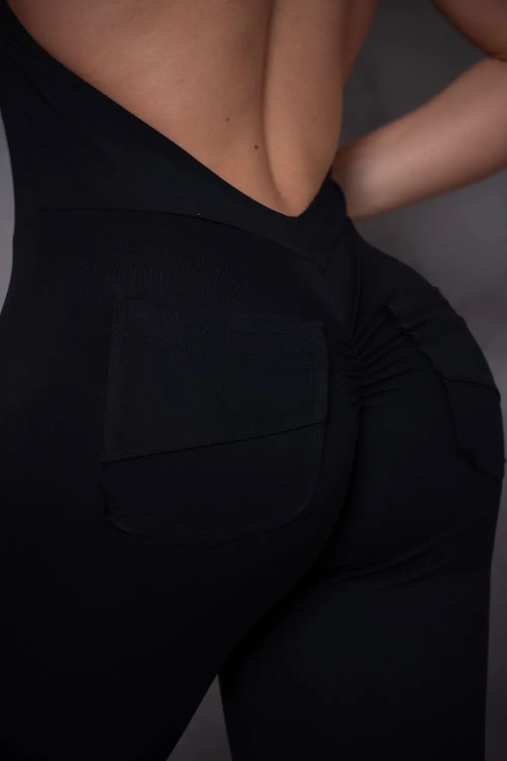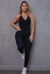 Macacão longo preto com busto decotado em V e costas livres que trazem sensualidade e frescor ao look. A silhueta com uma amarração elegante e efeito empina bumbum, feito em tecido que harmoniza com o tom da pele. Ideal para treinos ou ocasiões casuais, combina conforto com estilo discreto e sofisticado.