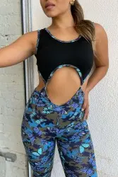 Novo macacão longo, azul com estampa de borboletas e top preto contornado com a mesma estampa. O abdômen é recortado ao redor da cintura, ressaltando as curvas e trazendo maior charme para esse look super gracioso e cheio de confiança. Perfeito para desfilar nas academias ou em situações casuais.