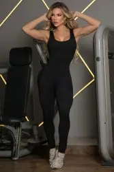 Macacão fitness preto de alta compressão com modelagem anatômica que valoriza intensamente as curvas. Oferece sustentação, conforto e total liberdade de movimento. O decote frontal arredondado realça o colo de forma elegante, enquanto as costas possuem recorte cavado e abertura central que garante ventilação e um toque de sensualidade. A parte inferior conta com franzido estratégico no bumbum, que realça o contorno com efeito empina. Ideal para treinos intensos ou composições urbanas sofisticadas, é uma peça versátil, prática e imponente.