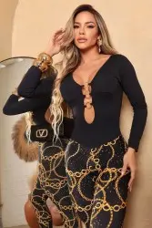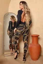 Macacão sofisticado com estampa de correntes douradas sobre fundo preto, modelagem justa que valoriza as curvas e decote frontal com detalhe em argolas. Costas abertas para um toque de ousadia e elegância.