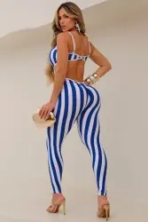Macacão listrado azul e branco, com modelagem justa que valoriza as curvas. Possui recorte frontal com amarração no busto e costas abertas, trazendo um toque sensual e moderno. Perfeito para destacar estilo e ousadia em qualquer ocasião.