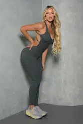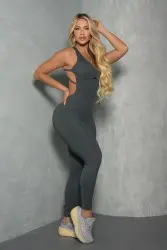 O macacão é confeccionado em tecido justo e elástico, de cor preta, modelando a silhueta. Possui decote em “V” com franzido discreto no busto e alças finas que se cruzam nas costas, deixando a parte traseira quase totalmente aberta. A cintura é marcada pela própria modelagem, que alonga e valoriza a forma do corpo. A calça é estilo legging, de cós alto e caimento rente ao corpo, com acabamento liso e sem recortes aparentes, conferindo um visual minimalista e sofisticado.