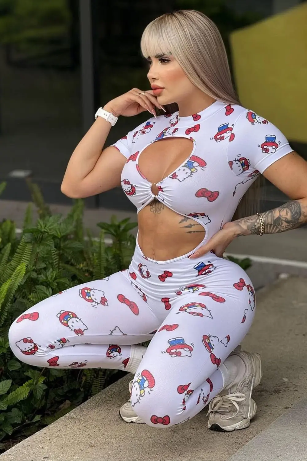 A peça apresenta uma estampa full print divertida e charmosa da Hello Kitty, combinando o fundo branco com detalhes em vermelho e azul. Confeccionado em tecido de alta elasticidade e compressão, o macacão proporciona excelente sustentação e modela o corpo, valorizando a silhueta.