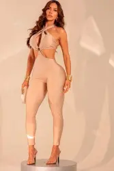 Macacão em tecido acetinado com brilho sutil, modelagem justa que realça as curvas e recortes estratégicos que valorizam a silhueta. Possui decote torcido com argola central e amarração nas costas, combinando sensualidade e sofisticação em uma peça única e marcante.