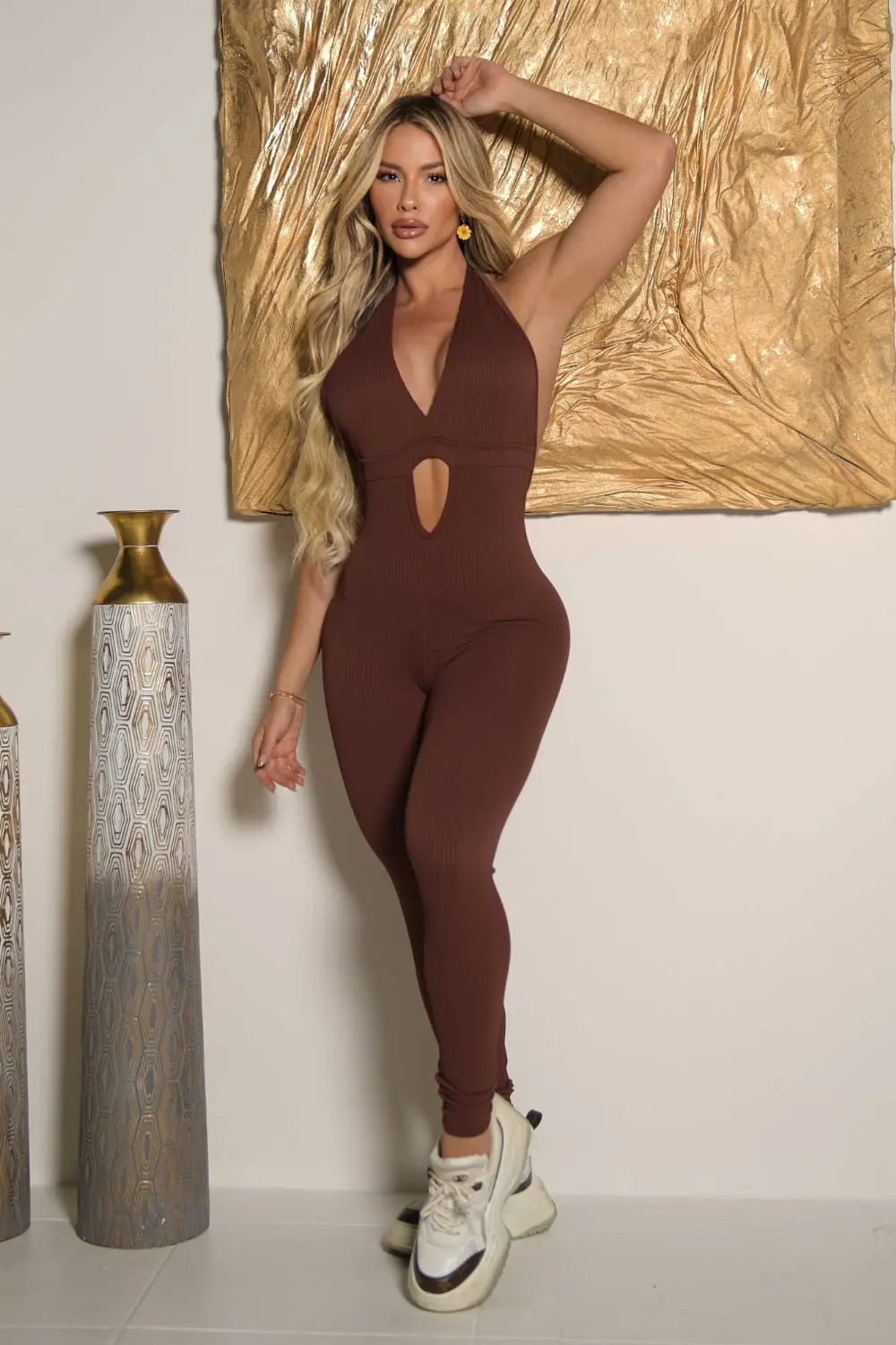 O macacão é confeccionado em tecido canelado, com modelagem justa que valoriza as curvas e proporciona conforto. Possui decote profundo em “V” e detalhe vazado frontal, adicionando um toque moderno e sensual. As costas são totalmente abertas com amarração no pescoço, destacando a silhueta. O tons de cores disponíveis trazem sofisticação e versatilidade, ideal para composições elegantes e contemporâneas.