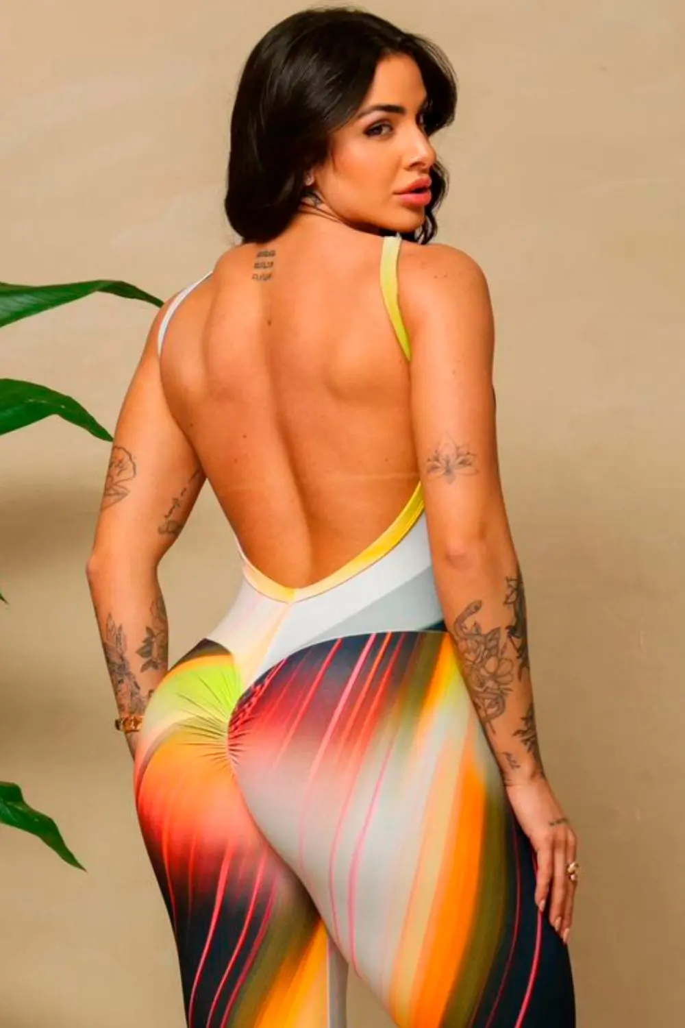 Macacão fitness de design exclusivo com estampa multicolorida em efeito degradê, que valoriza a silhueta e alonga o corpo. Possui modelagem justa, tecido de alta elasticidade e excelente compressão, garantindo conforto e sustentação. Destaque para o decote e costas abertas, que trazem modernidade e sofisticação ao visual, ideal para treinos ou produções fitness elegantes.
